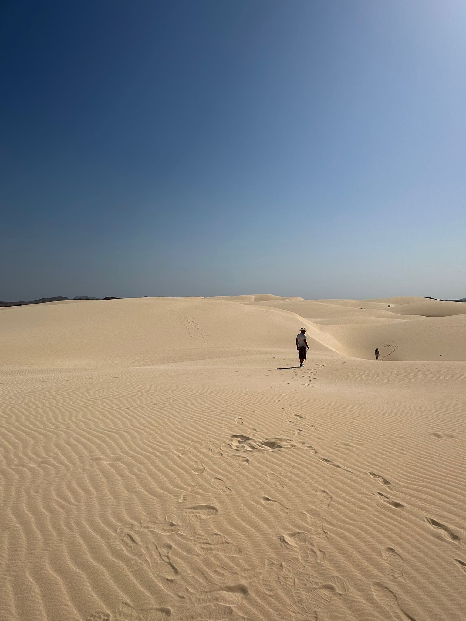 White sand deserts that stretch for miles, always in motion because of strong winds.